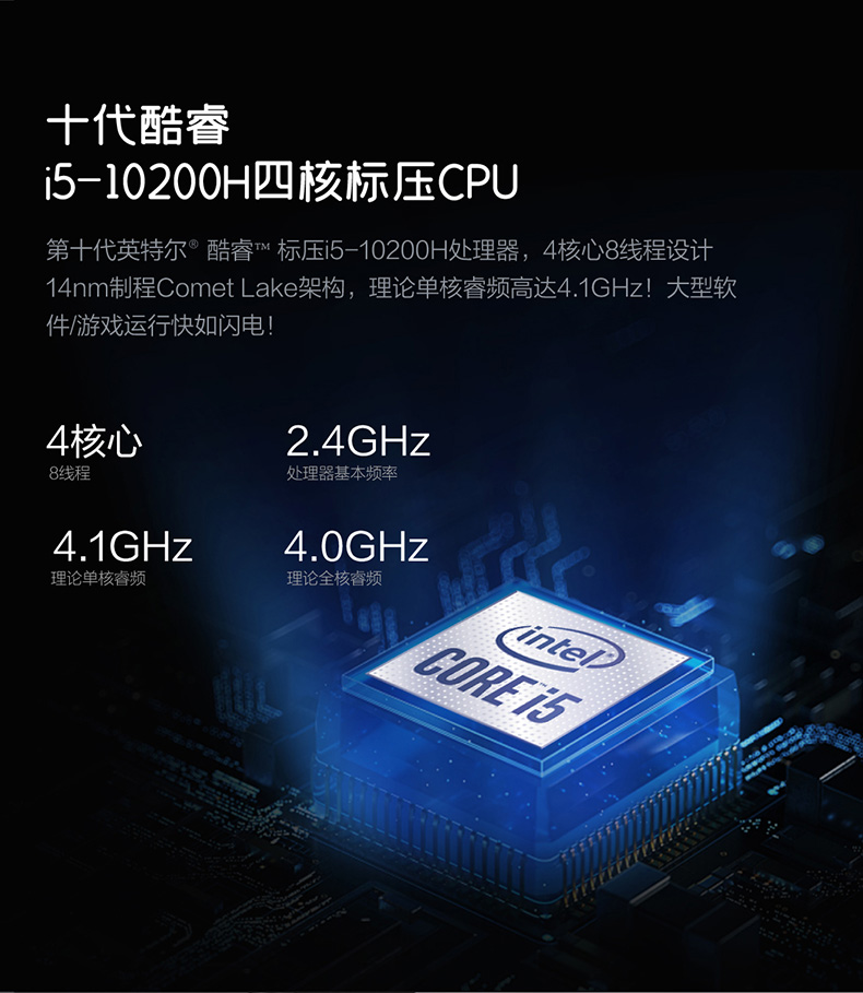 第十代英特尔® 酷睿™ i5-10200H 标压处理器,四核八线程,
